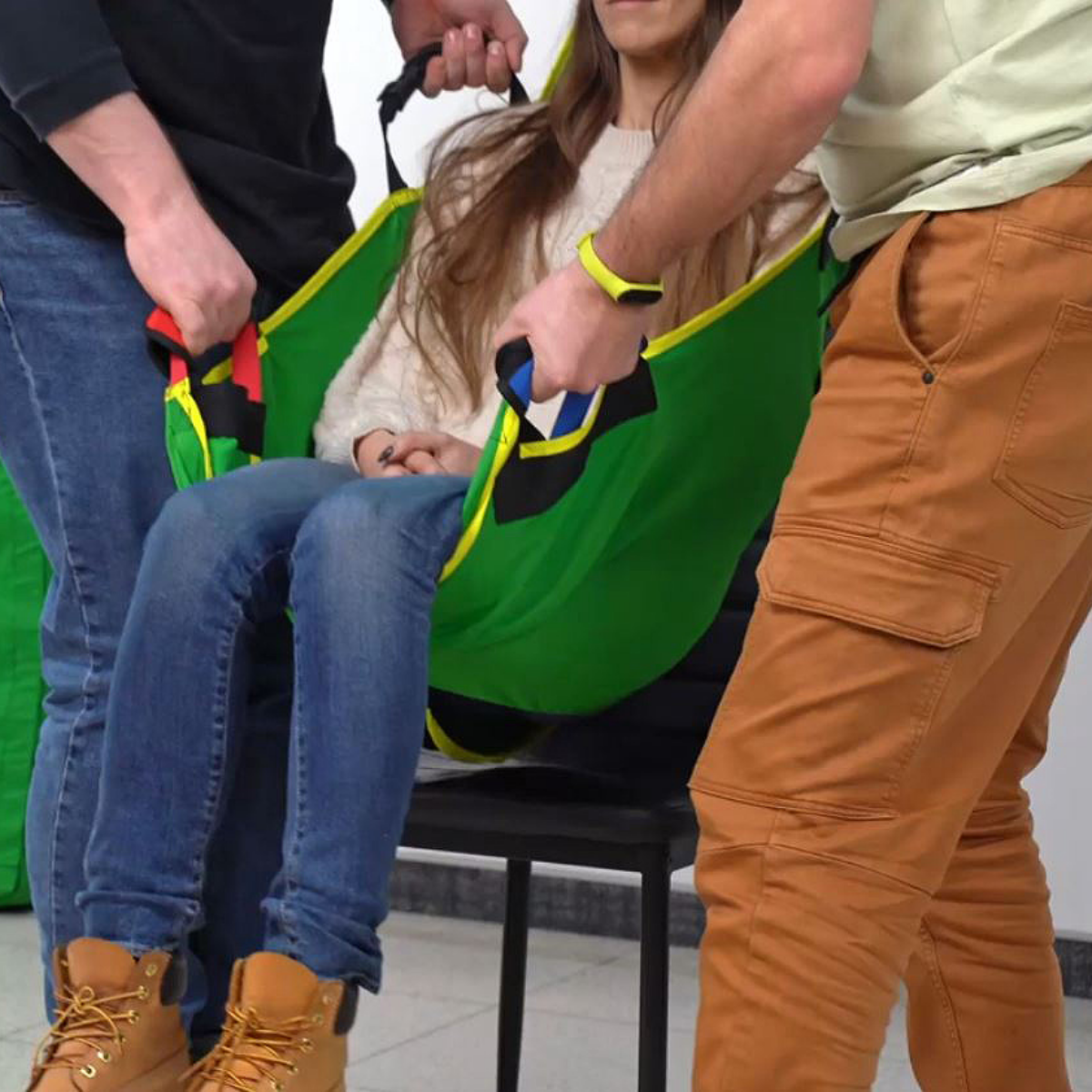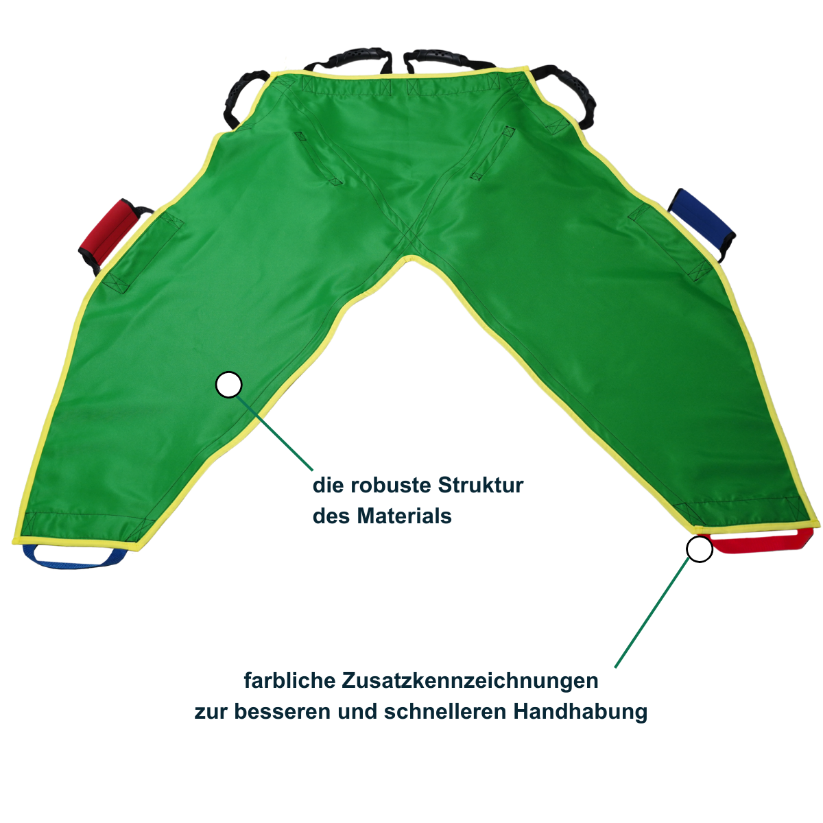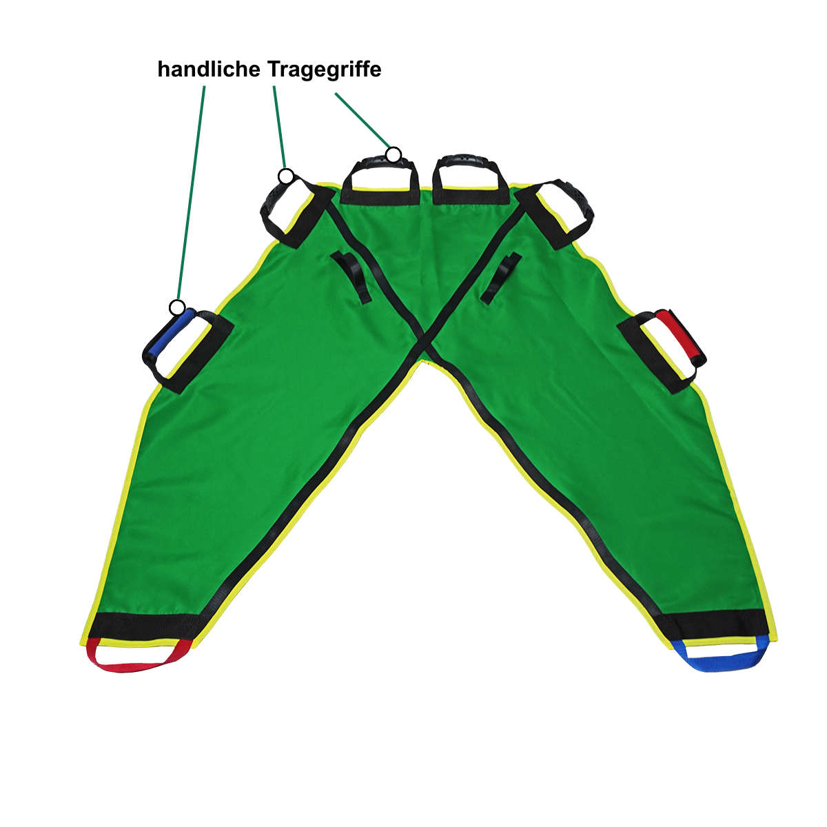 Für eine präzise Handhabung ist der Hebegurt EASY MOVE mit insgesamt 8 stabilen Tragegriffen ausgestattet, die eine flexible Kraftverteilung während des Hebevorgangs ermöglichen. Die Sicherheit steht an oberster Stelle: Der Anwender muss darauf achten, ruckartige Bewegungen strikt zu vermeiden, um Verletzungsrisiken für die zu transportierende Person auszuschließen. Während des gesamten Transfers darf der Hebegurt EASY MOVE niemals losgelassen werden. Zudem ist eine lückenlose Beaufsichtigung des Patienten zwingend erforderlich. Diese klaren Anwendungsvorgaben gewährleisten in Kombination mit der robusten Bauweise einen kontrollierten und risikoarmen Transport.