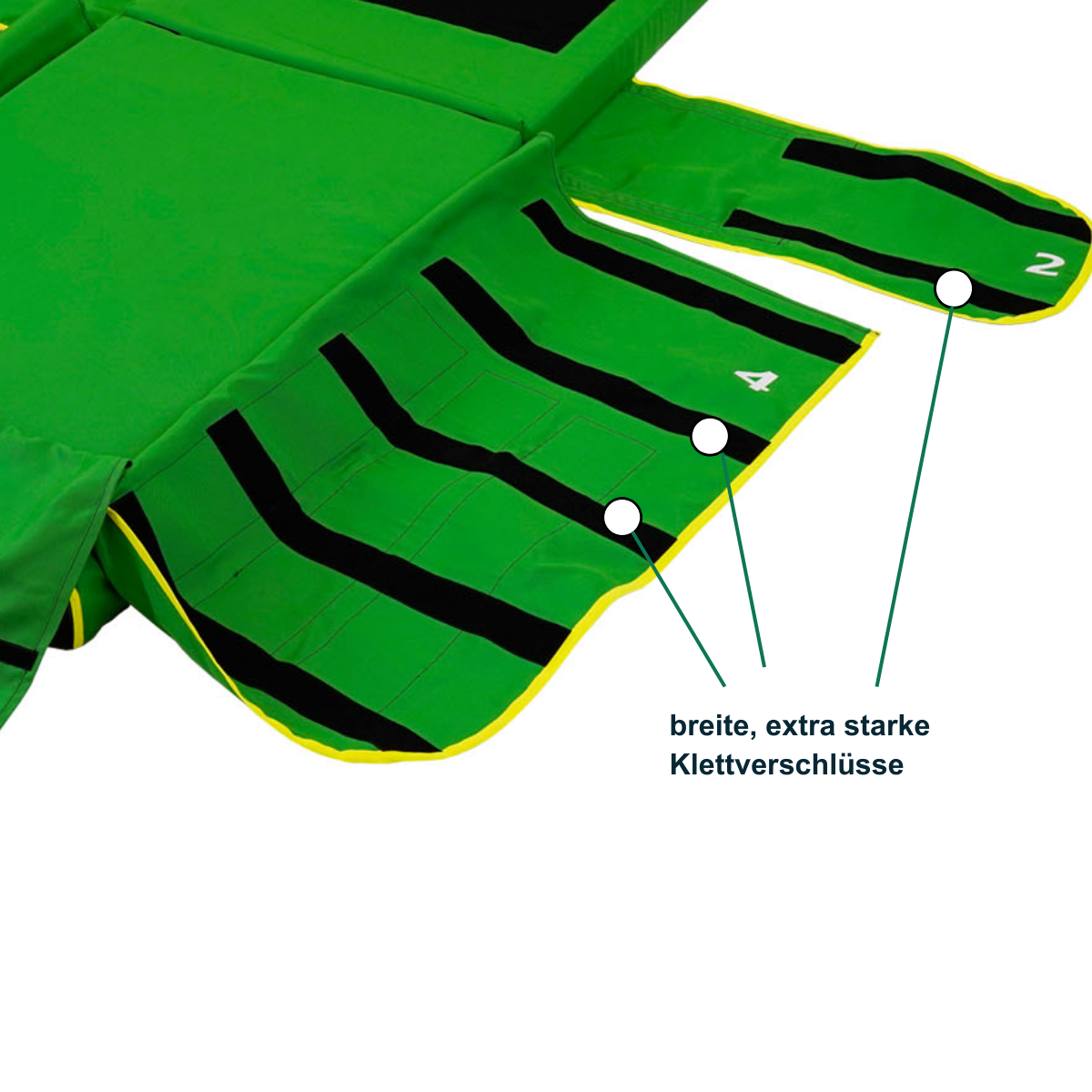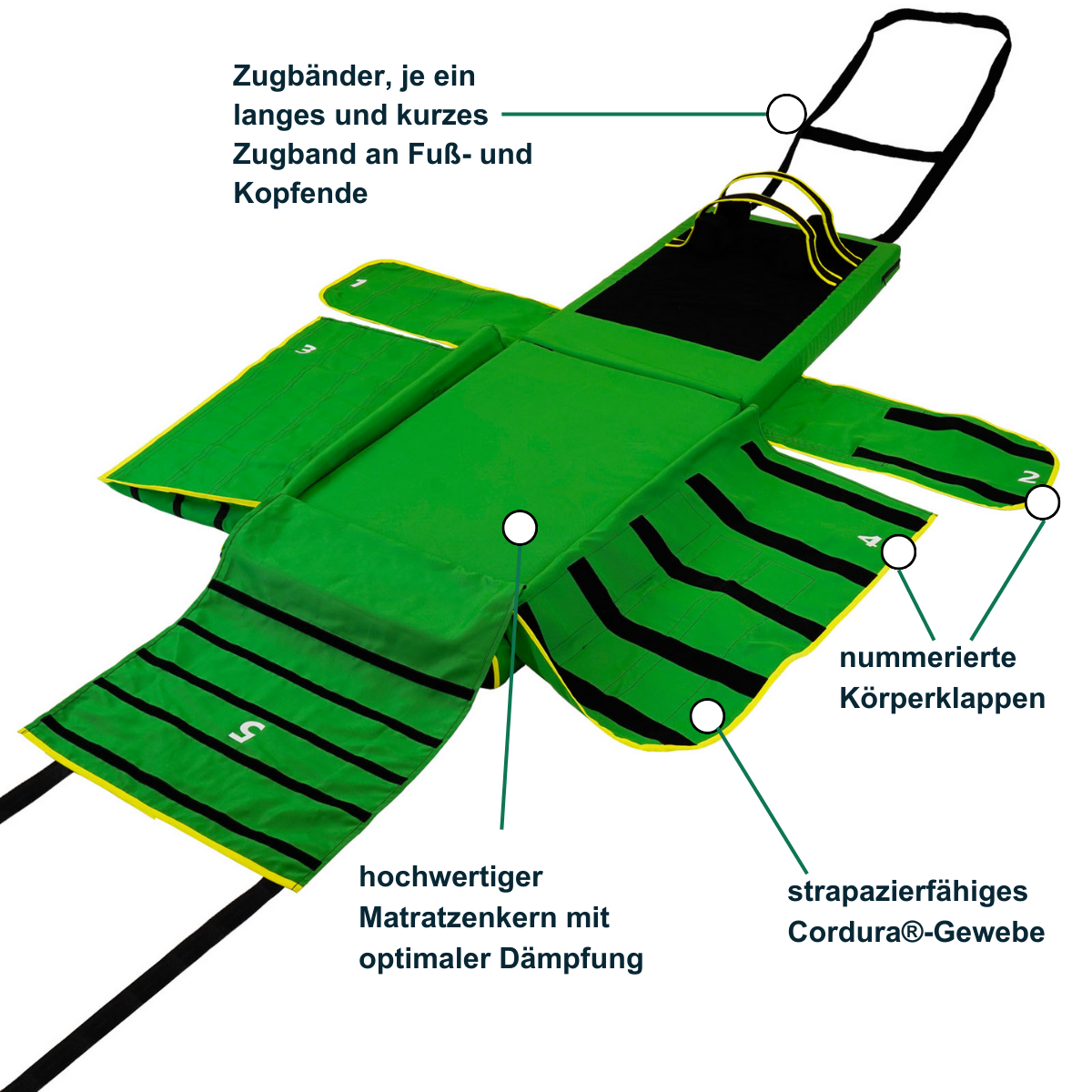 Im Zentrum des Designs steht die Patientenstabilisierung. Die PRIME Evakuierungsmatratze ist mit sechs separaten Sicherheitsgurten ausgestattet, die eine umfassende, mehrfache Fixierung garantieren. Die nummerierten Körperklappen erleichtern dabei dem Personal das schnelle und korrekte Anlegen der Gurte an dem zu Evakuierenden. Ergänzend dazu sorgt die variable Kopfstütze inklusive Fixierungsband für eine individuelle Anpassung und verhindert Kopfbewegungen beim Transport. Der hochwertige Matratzenkern mit optimaler Dämpfung schützt zuverlässig vor Stößen und Erschütterungen. Ein entscheidendes Novum ist die integrierte, harte Platte unter den Füßen (Tuplex), die eine zusätzliche Längsstabilisierung des Körpers bietet. Dies ist essenziell für verletzte oder sehr immobile Personen.