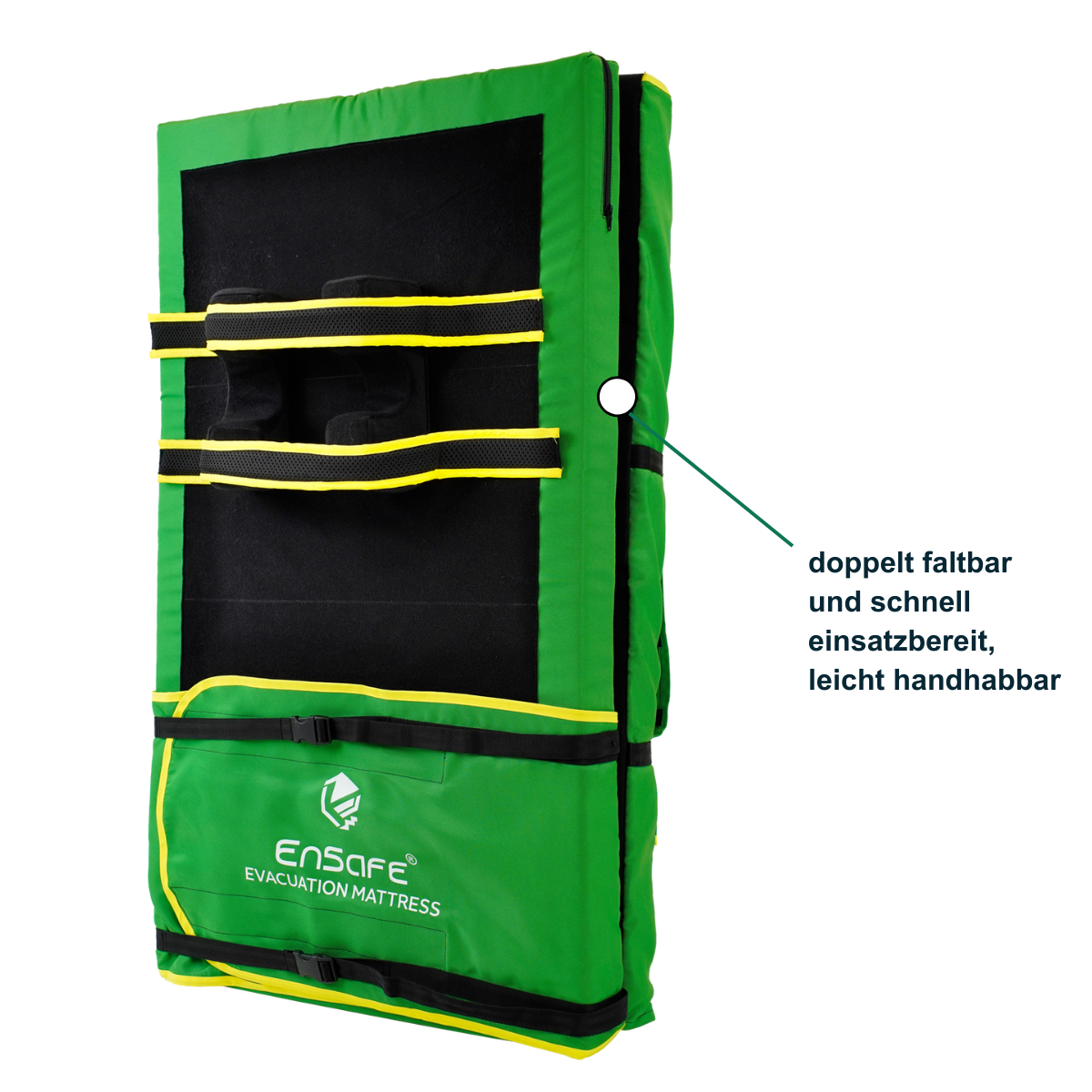 Um auch im Extremfall ausreichend geschützt zu sein, verwenden wir strapazierfähiges Cordura®-Gewebe. Dieses Premium-Material ist extrem widerstandsfähig gegen Abrieb und Risse und kombiniert dies mit der Sicherheit eines schwer entflammbaren Stoffs. Reflektierende Elemente maximieren die Sichtbarkeit in verrauchten oder dunklen Fluren. Die Handhabung ist dank des doppelt faltbaren Designs und der Zugbänder (je ein langes und ein kurzes an Kopf- und Fußseite) intuitiv und schnell. Die PRIME Evakuierungsmatratze ist sofort einsatzbereit. Optional erhalten Sie eine Aufbewahrungshülle. Für eine strategische und platzsparende Lagerung kann die PRIME Evakuierungsmatratze zudem an der Wand montiert werden.